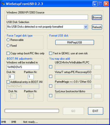 Hola amigos bakunos les traigo este programa, no se si este por aqui en el corral pero bueno espero que no,este programa se llama WinSetupFromUSB en su mas nueva version 0.2.3 y la unica que me ha funcionado como si instalara un xp desde cd. este programa es capaz de darle el sector de arranque a nuestra usb y instalar windows xp desde ella, bueno yo lo probe con xp pero tiene otras opciones las cuales te permiten instalar windows vista y 7,linux, desde otras opciones ( no se si funcionen, ya que solo probe instalar xp sp3 a una notebook y me quedo de maravilla 100%)