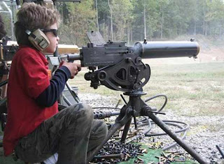 “Aquí no necesitamos psiquiatras ni divanes. Aquí tenemos armas automáticas, eso si es una buena terapia…” dice uno de los organizadores del festival de la metralleta en Knob Creek, Kentucky. El reportero que ha visto escenas parecidas en Irak o Afganistán se queda perplejo al ver cómo niños de muy corta edad saben disparar un M-16 o desmontar una Uzi israelí. Muchos de estos niños escriben su carta a Santa Claus incluyendo en su lista la última versión de su arma favorita.